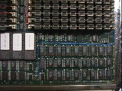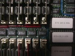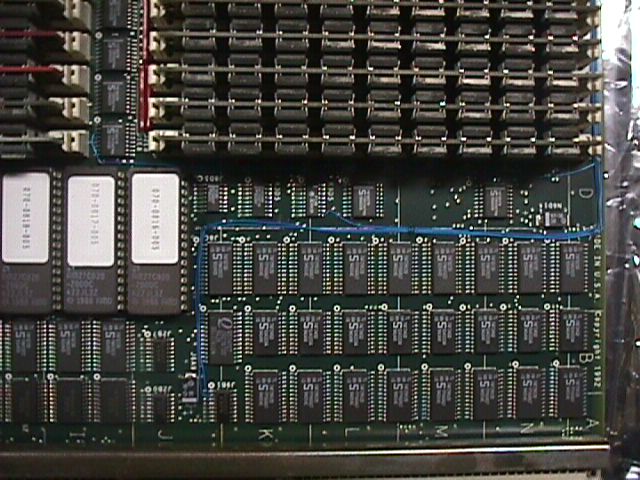 The four wires go along the top of the IP17 from the chip shown in part 1. This picture is oriented such that the backplane connectors are parallel with the bottom of the photo. Wire ? splits off from the rest just past the SIMM bank and heads down to a chip between the two banks shown. Wires ?,? and ? continue down to the chips shown in part 3.