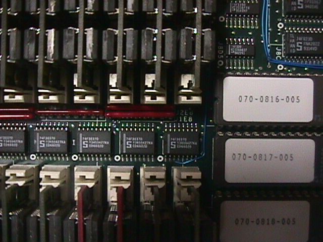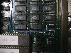 The four wires go along the top of the IP17 from the chip shown in part 1. This picture is oriented such that the backplane connectors are parallel with the bottom of the photo. Wire ? splits off from the rest just past the SIMM bank and heads down to a chip between the two banks shown. Wires ?,? and ? continue down to the chips shown in part 3.