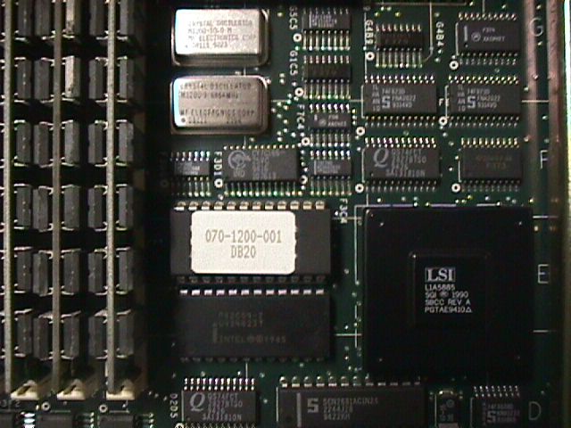 Here's a picture of the chip and its surrounds just in case the location number doesnt get you there. To orient youself, this picture is taken such that the backplane connectors are parallel to the right hand side of the image with the lower rear SIMM slot visible at the left.